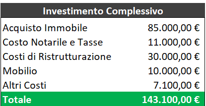 L’investimento complessivo stimato è di circa 143.000 euro (come dettagliato nella tabella 1), suddiviso tra 85.000 euro per l’acquisto dell’immobile, 40.000 euro per ristrutturazione e arredamento, oltre alle spese accessorie.